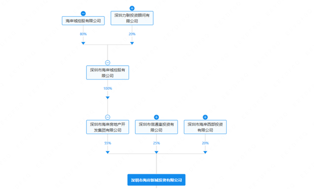 股权穿透显示,海岸新城投资由深圳市海岸房地产开发集团有限公司(简称:深圳海岸集团或海岸集团)、深圳市信通瀛投资有限公司、深圳市海岸西部投资有限公司分别持股55%、25%、20%。